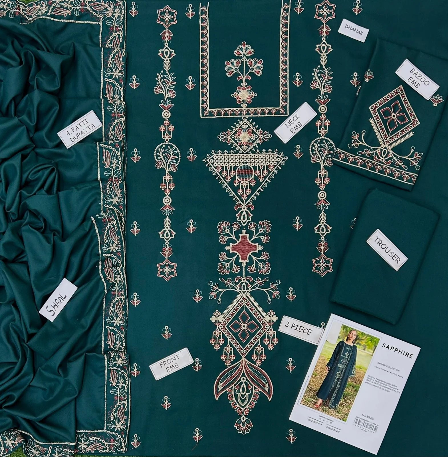 The Sapphire Dhanak Embroidered 3 Piece | SP112| - Trendy Outfits -Anu Jee is a celebration of timeless elegance and winter sophistication — a perfect blend of tradition, luxury, and comfort. Designed in a rich emerald green hue, this outfit exudes regal charm and understated grace, making it an ideal choice for the modern woman who values refinement in every detail.
